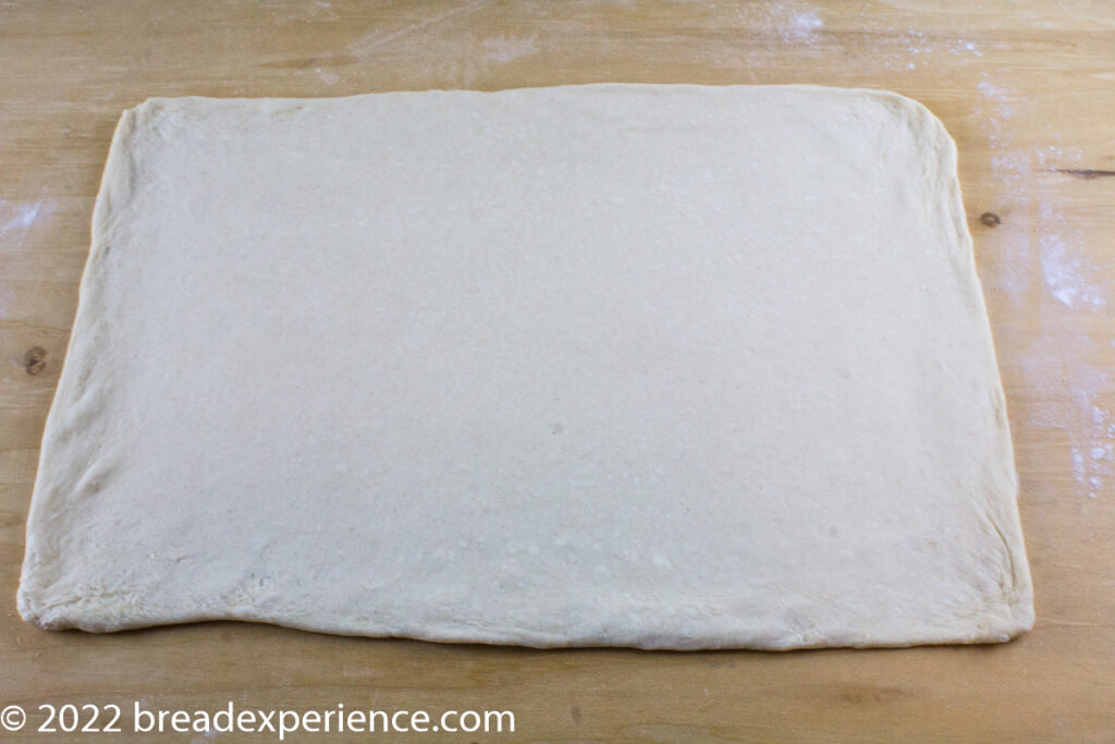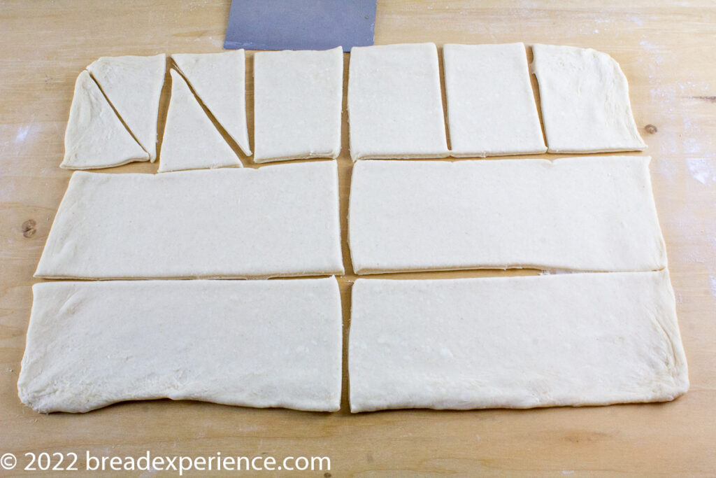 - To shape, roll the dough out on a lightly floured surface into a rectangle about ¼-inch thick. (I was aiming for a 15×18 inch rectangle to make larger crescents, but ended up with a 12×17 rectangle so I made mini crescents.)