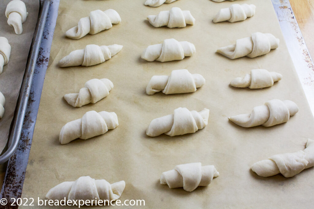 - Using a pizza cutter or sharp knife, cut the dough in half lengthwise, cut the strips into triangles. Roll each crescent up using both hands. Place on a lined baking sheet about 2-3 inches apart. Cover with a tea towel and set in a room temperature place to rise for 30 minutes to 1 hour, or longer if needed. (Not too warm or the butter will melt and there will be fewer layers.)