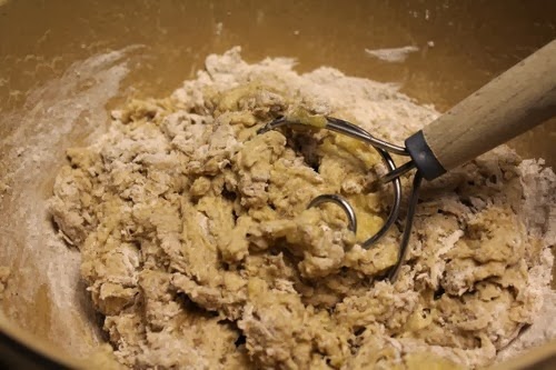 Add in 3 tablespoons of butter, a little at a time, and thoroughly incorporate into the dough by squishing it between your fingers. It may take a few minutes to work the butter completely into the dough.