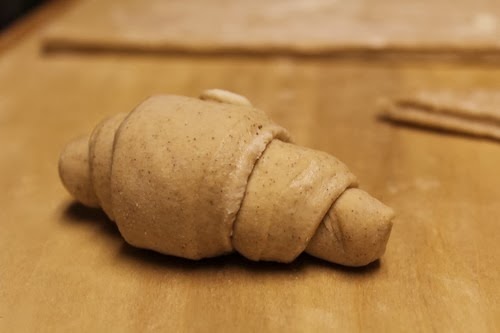 Cut into 16 or 32 wedges. Roll up each wedge, starting at wide end.