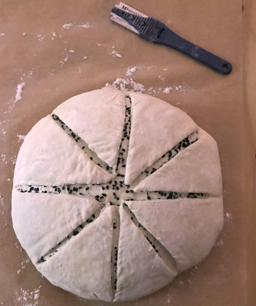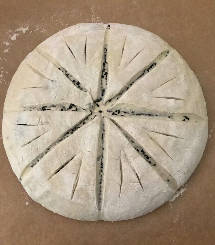 - Using a blade or lame, score smoothly along the marked spokes, starting from the center down to the sides. Cut through the outer dough layer, deep enough to reach the sesame seed layer, but not beyond. The scoring cuts should be neat and separated and you should be able to see the sesame seed layer.