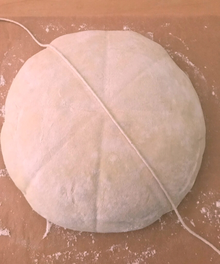 - Lightly dust the surface of the dough with flour. Using a piece of string or twine, mark the surface into 8 equally spaced spokes, similar to a wheel.