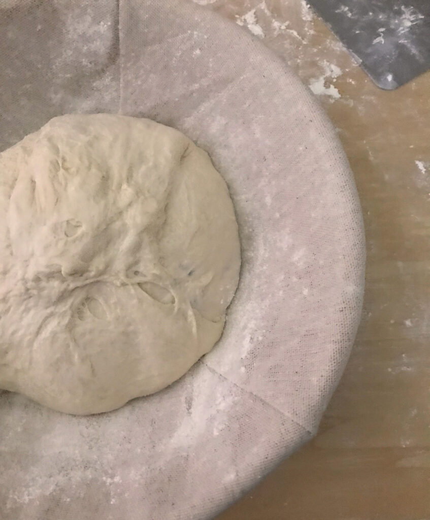 - Gently place the wrapped loaf seam-up in a lightly floured round banneton proofing basket.