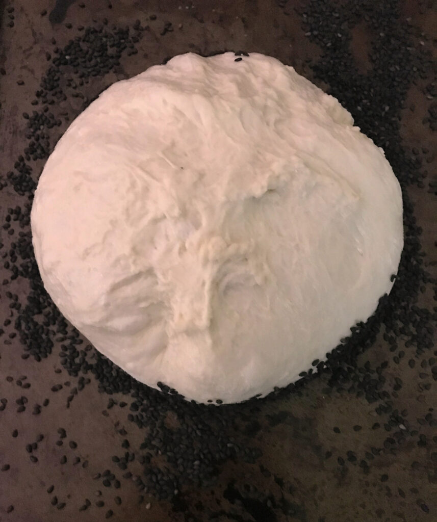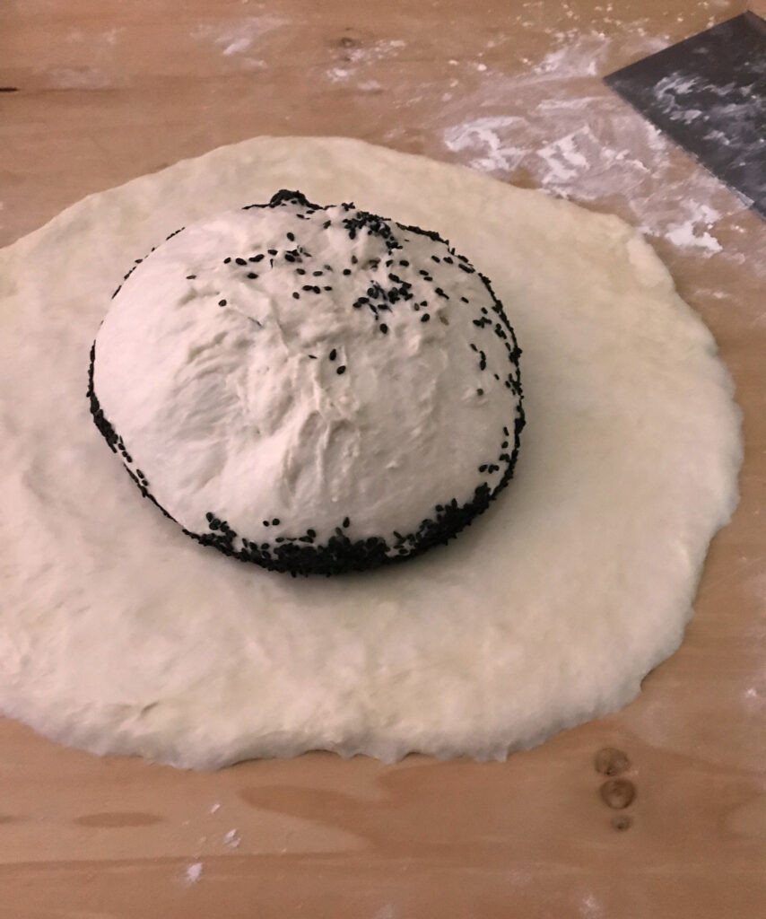 - Carefully place the ball, with the sesame seed surface facing down, in the center of the disc. Gently lift and drape the disc up and over the boule to wrap it, pleating or folding the dough as needed. Don’t seal it too tightly underneath.