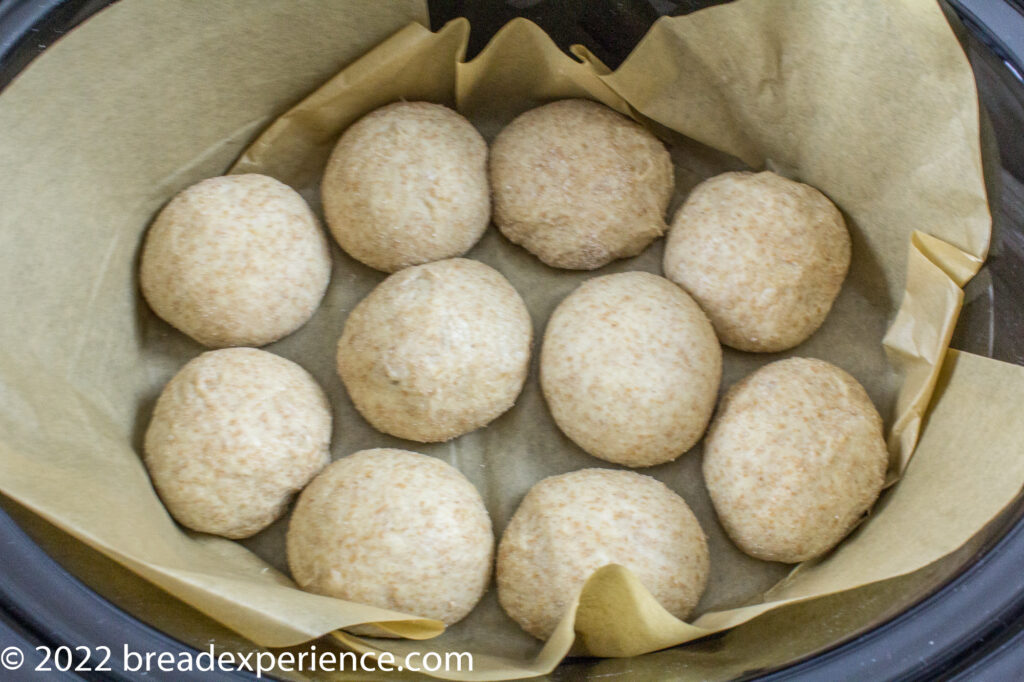 6. Divide the dough into 10 equal pieces (about 80 grams each). Roll each piece into a smooth ball and place in a single layer in the slow cooker.