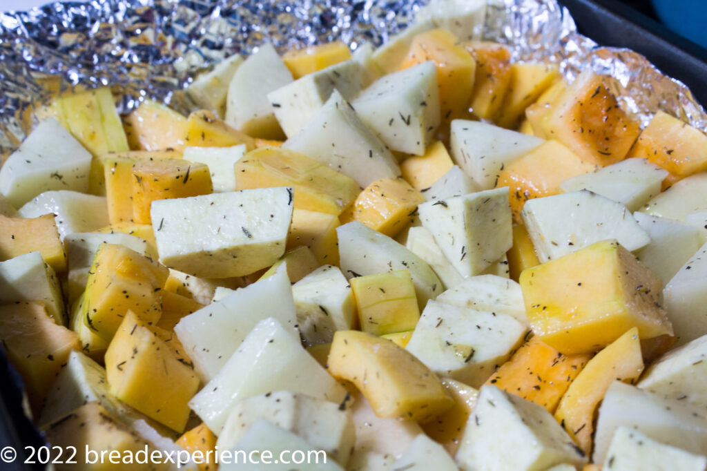 - Toss the cubed squash and potatoes with 1-1 ½ Tbsp. olive oil and 3/8 tsp. salt. Add fresh or dried thyme, if desired. Arrange the vegetables on the baking sheet.