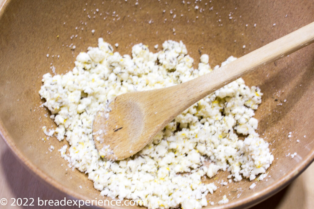 - Mix the feta, lemon zest, lemon juice, and thyme until thoroughly combined. You can use a food processor to break up the feta crumbles but a potato masher works as well.