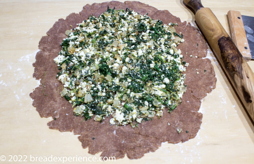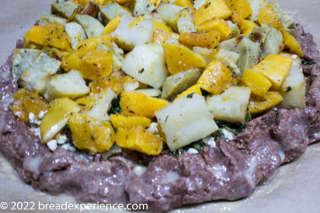 - Spread the spinach mixture over the dough, leaving a border of about 1 ½ inches. Place the roasted vegetables on top. Fold the edges of the dough in toward the center. Overlap the edges as needed. Brush the edges of the crust with the egg wash.